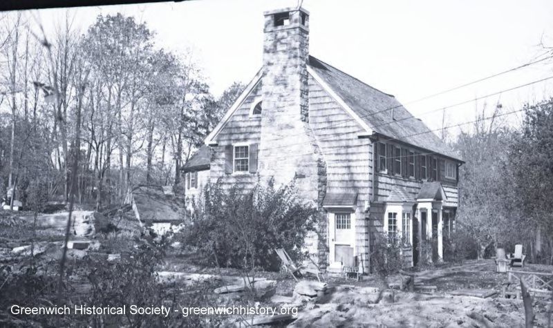 Two story shingle home with first floor bay window, pediment at front entrance, and exterior stone chimney with quarter round window on the side.Collection