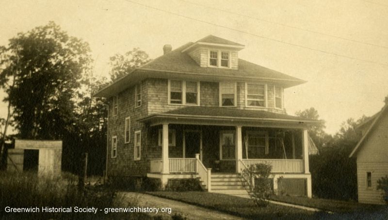 Two story, shingled residence of W. A. Mombert with a full-width front porch, top and bottom bay windows in the front and a dormer with two windows in the roof. A detached garage is at the end of the driveway.Collection