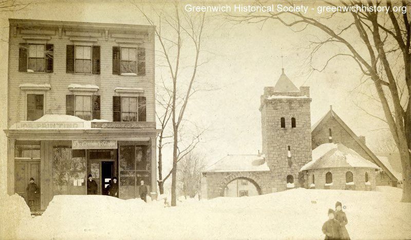 The Greenwich Graphic at the top of Greenwich Avenue and the original First Presbyterian Church at 18 Lafayette Place after the blizzard of March 12-13, 1888. Signs for Line Printing and Edward Bros. are above the Greenwich Graphic storefront.Collection