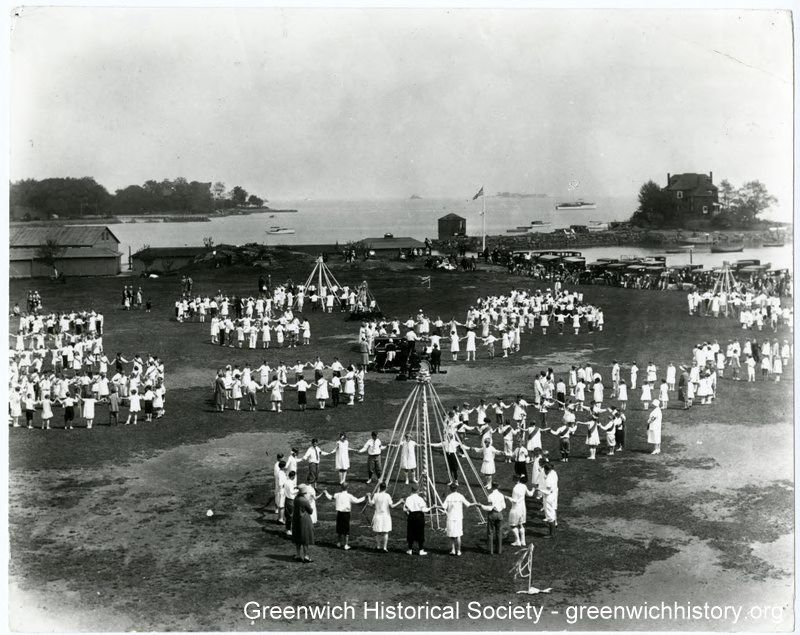 Large circles of children and adults, some surrounding May Poles, at Byram Park Harbor. An organ and other musical instruments are being played in the center of the field. Cars are parked on the side of the field and boats are visible in the water.Collection