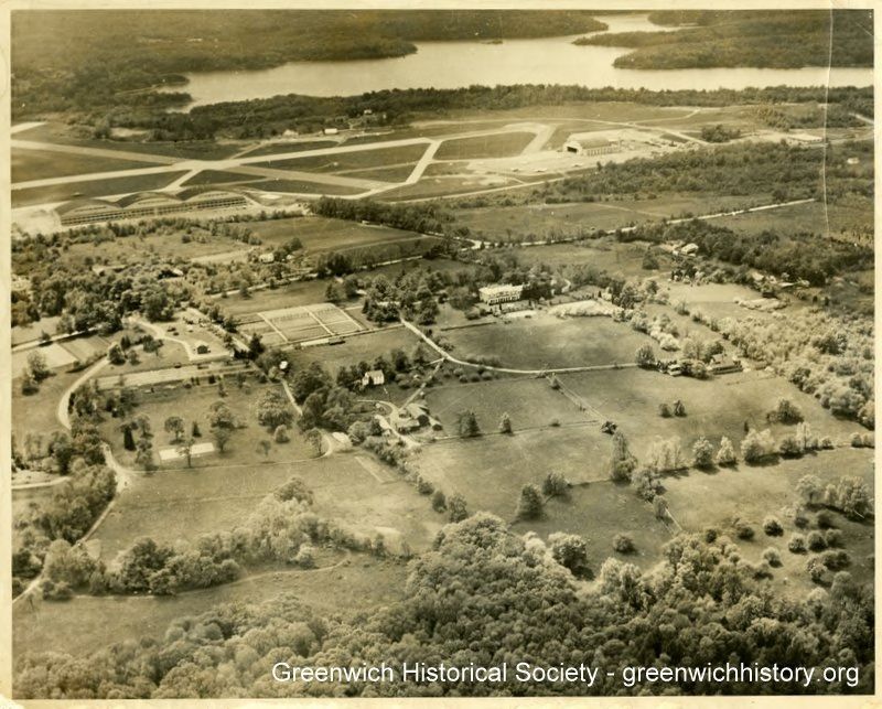 Aerial view of James Steers's estate, Faircroft (a Great Estate), on King Street across from the Westchester County Airport. Rye Lake is behind the airport. The estate included farm fields and buildings, including the farmhouse occupied by Fred Fields, the previous owner, who continued to manage the property for the Steerses. The original estate house, built in 1095, was rebuilt in 1925 after a fire. Later owners of the estate included Claire Booth Luce and Avco Corporation, which located it's corporate headquarters there.Collection