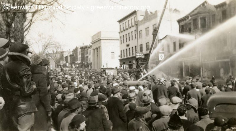 People watching the fire and firefighters on Greenwich Avenue between Lewis Street and Elm Street, looking north towards corner of Lewis Street and the Putnam Trust Company building at 125 Greenwich Avenue. Whelan Drugs, at 151-153 Greenwich Avenue, is in the center of the photo.Collection