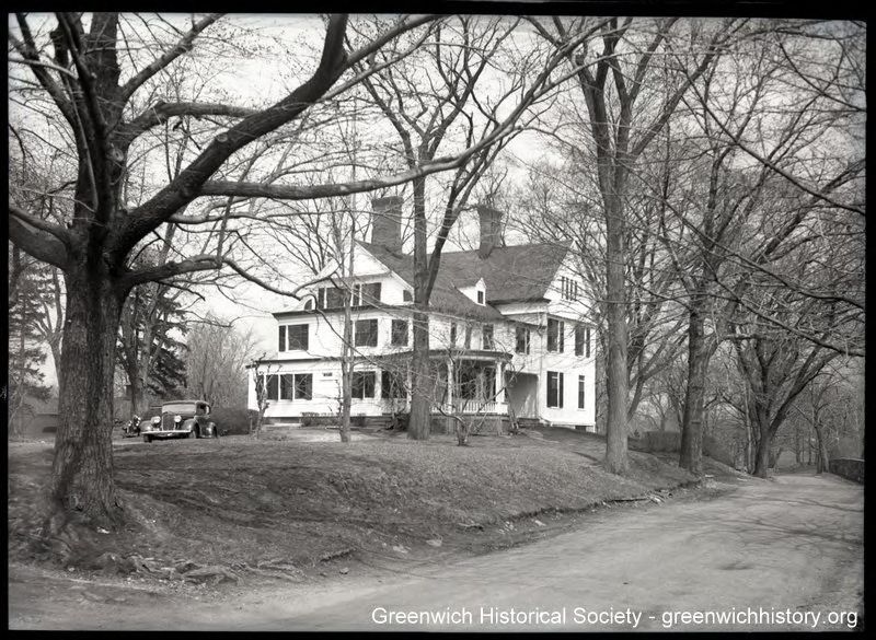 Large, two and one-half story, wooden home with circular porch at the corner, two center chimneys and multiple dormers. Large, old trees line the street in front of the house and a car is parked in the driveway.Collection