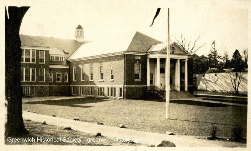 Glenville School (now Western Greenwich Civic Center), 449 Pemberwick Road. "L" shaped, brick building with a cupola on the roof, a full-height front pediment with two-story classical columns, and a double door front entrance beneath a fan window. A flagpole is in the yard.Collection