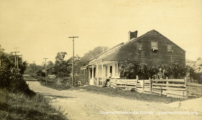 Toll House on West Putnam Avenue, looking northwest. Utility lines and poles are visible on both sides of the dirt road. The house is a one and one-half story clapboard structure with a center chimney and a full-width front porch. A man is sitting in a chair on the porch. The side yard has a rustic fence around it and tall vines growing near the house.Collection