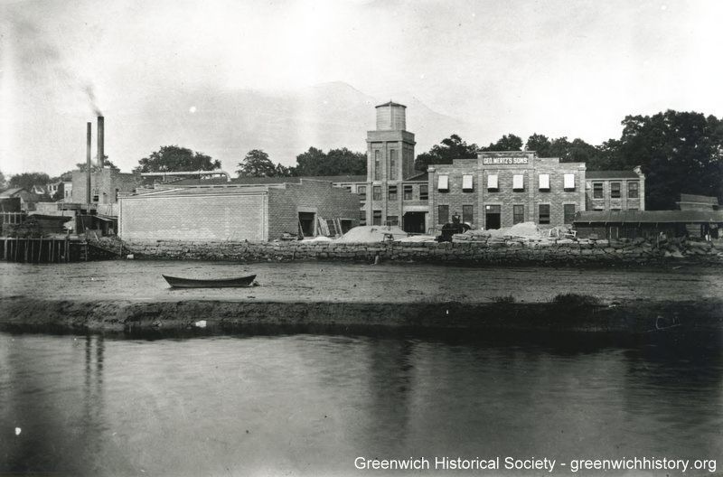 Two story brick factory building with a water tower in the center and smokestacks on the left end. Awnings extend over some of the second story windows and a sign reading "GEO. MERT'S SONS " is printed on the top of the building. The building is located next to the water.Collection