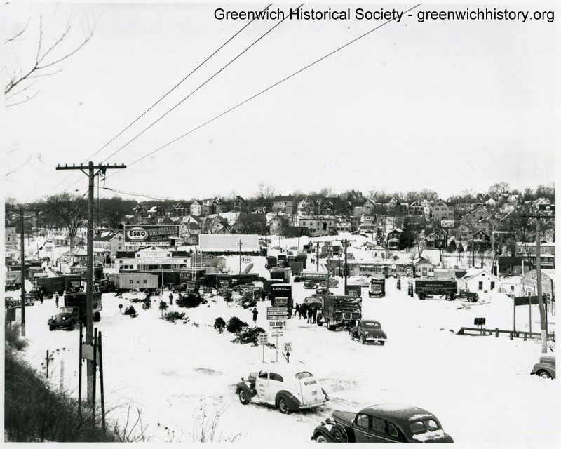 Commercial area of Byram covered in snow. Cars and trucks are stopped on the roads and people are standing beside the vehicles. A street sign points to the right for "Hutchinson Parkway, New York, Port Chester. "Commercial signs are visible for "Esso Abel's Service Station," "Kesbec Lubricating Service," "Old Post Grill," and "Beer, Wine & Liquor." Several trucks advertise "D & N," "Lowell," "Burgess Espress Co.," and "Rudolf." A police car is in the foreground. Telephone and electric poles and lines are on the sides.Collection