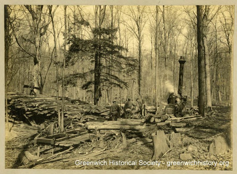 Lumbering operation near Arcadia in Sound Beach (now called Old Greenwich). Five laborers work with the lumber and a large machine is in the background.Collection