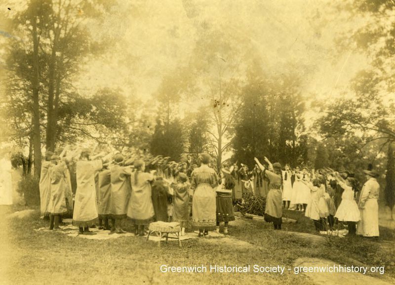 Camp Fire Girls in costurme standing in a circle with arms raised around a pile of sticks on the property of the Agassiz Association.Collection