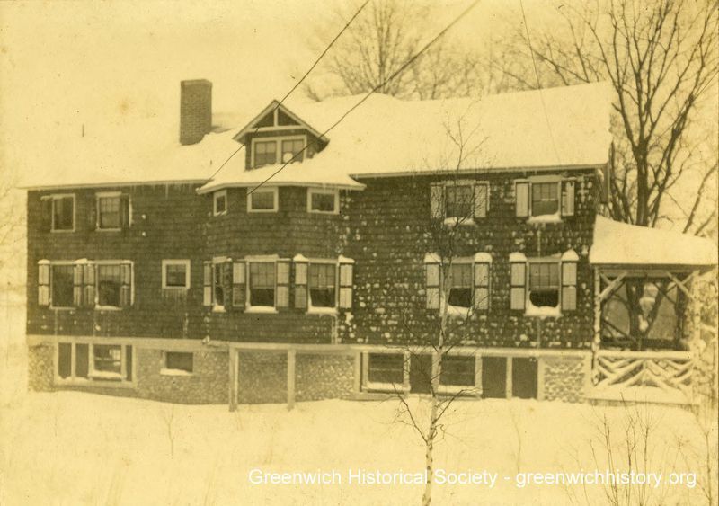 Side view of Birchen Bower, the home of Dr. Edward F. Bigelow, founder of Arcadia, covered in snow. The two story house has bay windows and shutters on the side and a dormer in the roof. A full width front porch with distinctive rustic posts and railings extends off the front. The house was located on the north side of Arcadia Road between Park and Highview Avenues, at approximately 44 Arcadia Road, in Sound Beach (which is now called Old Greenwich).Collection