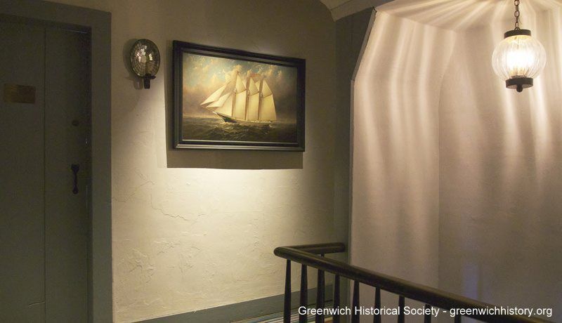 Detail of upstairs hall (room 208) in the Bush-Holley House. A reflective candlestick hands between the door and a painting of a ship on the wall.Collection