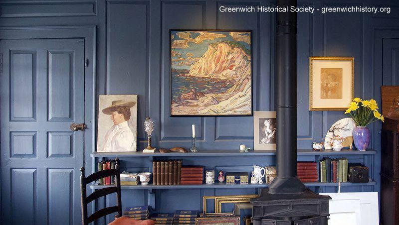 Detail of south wall of Elmer MacRae's studio (room 205) at the Bush-Holley House, featuring a portrait of his wife Emma Constant and his cliffside painting, Gayhead, completed in 1915 after the Armory Show of 1913.Collection