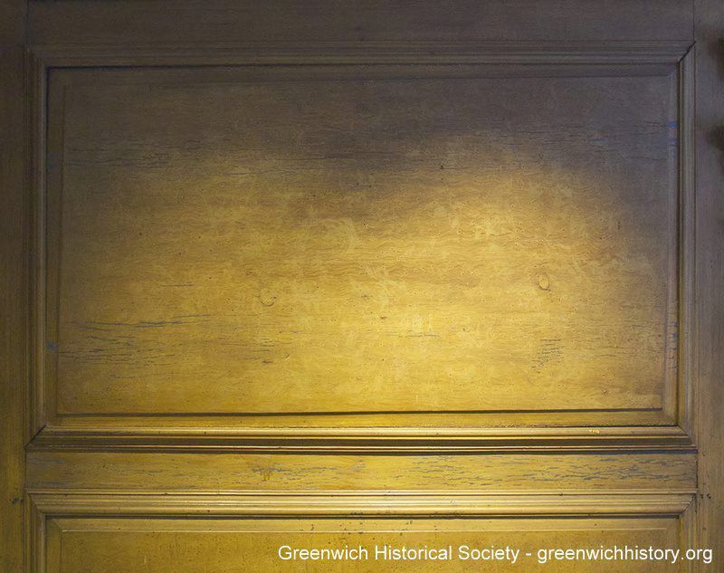 Detail of the panel above the fireplace in Justus Luke and Sally Bush's bedroom (room 203) in the Bush-Holley House. The paneling was painted bird's eye maple wood grain by Justus Luke, circa 1830, over the original blue painted finish,Collection