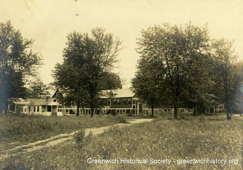 Distant view of Agassiz Association Executive Offices and Laboratory. The side of Birchen Bower, the home of Dr. Edward F. Bigelow is visible at right. These building were located at approximately 40 and 44 Arcadia Road, on the north side of Arcadia Road between Park and Highview Avenues, in Sound Beach (which is now called Old Greenwich).Collection