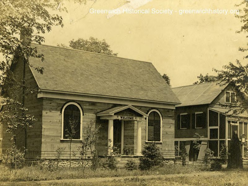 Reception building (left) of The Agassiz Association The unpainted shingle and clapboard structure has two arched windows in front with fitted arched shutters and a full-height, porch with pediment at the entrance. The sign at the front of the entrance reads, "welcome." This building was located at approximately 36 Arcadia Road (where the Old Greenwich Post Office is currently located), on the north side of Arcadia Road between Park and Highview Avenues, in Sound Beach (which is now called Old Greenwich).Collection