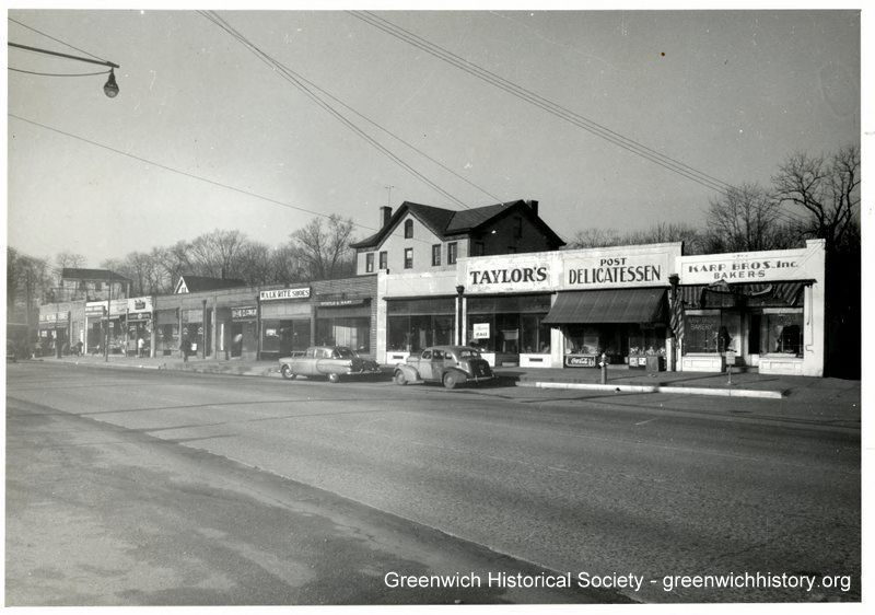 Shopping district on the Post Road in Cos Cob with cars parallel parked in front of the stores. The shops include First National Stores, Walk Rite Shoes, Myrtle & Mary, Taylor's, Post Delicatessen, and Karp Bros., Inc. Bakers. Telephone and electric lines and a stree light light are visible in the sky. A fire hydrant is visible at the curb.Collection