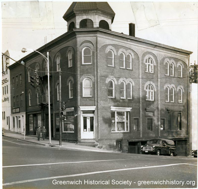 Multi-story brick building on the south east corner of Greenwich Avenue and Railroad Avenue before demolition. The main entrance to the building is on the corner. A sign in one of the ground floor windows reads " Francos Television Clinic." A truck is stopped at the traffic light and two men are walking on the sidewalk.Collection