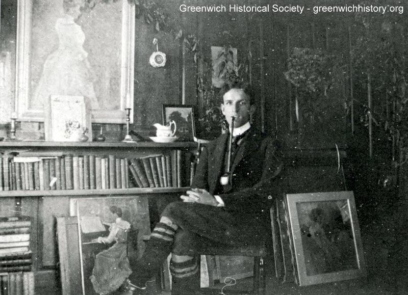 Elmer MacRae in his studio in the Bush-Holley house, seated with a long smoking pipe and surrounded by books and paintingsCollection