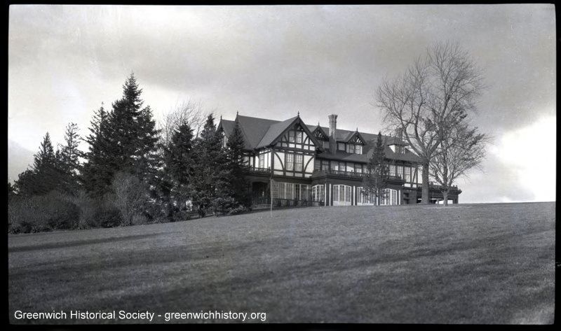 Distant view of the house and trees, showing evergreen trees down hill from the house and deciduous trees near the top of the hill. The house is a large stucco and stone English style home with half timbering on second floor and multiple gables in the roof line. Porticos extend from both ends of the house.Collection