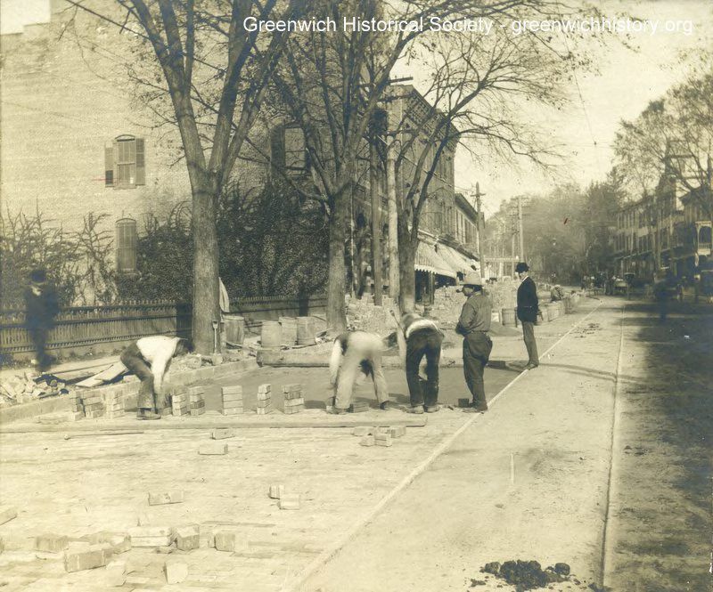 Workers laying bricks on Greenwich Avenue with trolley tracks and electrical line visible on the right. Horses and carriages are also partially visible near the buildings on the right. Telephone lines and poles are visible on the left.Collection