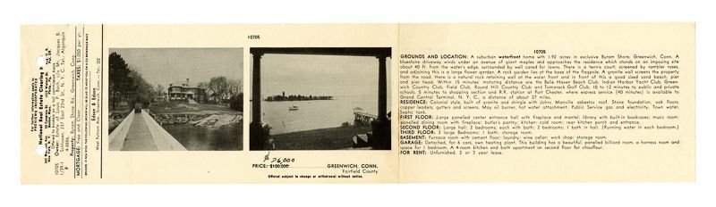 Ad showing a view of the house from a dock and a view from the house of Shell Island and Long Island Sound. Ad also has information about the location, grounds and interior of the house.Collection