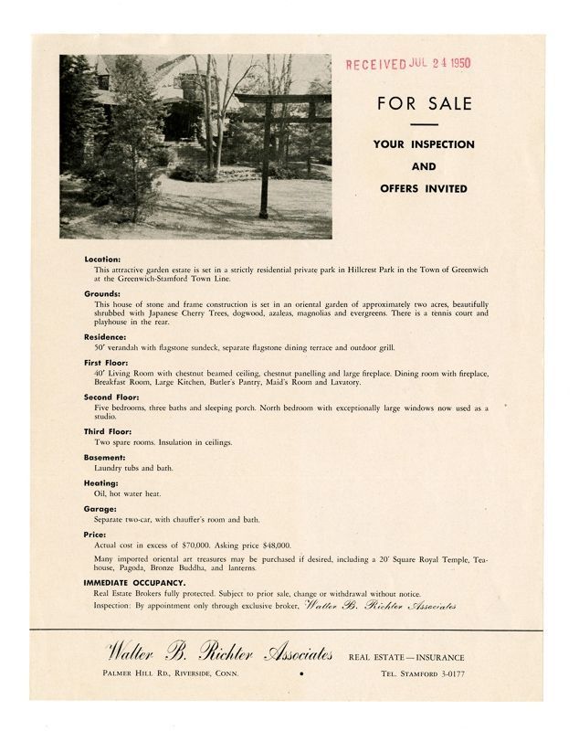 Ad with an image of the house from its lawn that has a torii gate in it. Ad also describes the location, and price of the property.Collection