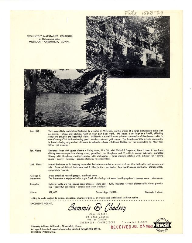 Ad with an image of the house and an image of a neighboring lake. Ad also includes information on the house's location, grounds, rooms, and price.Collection