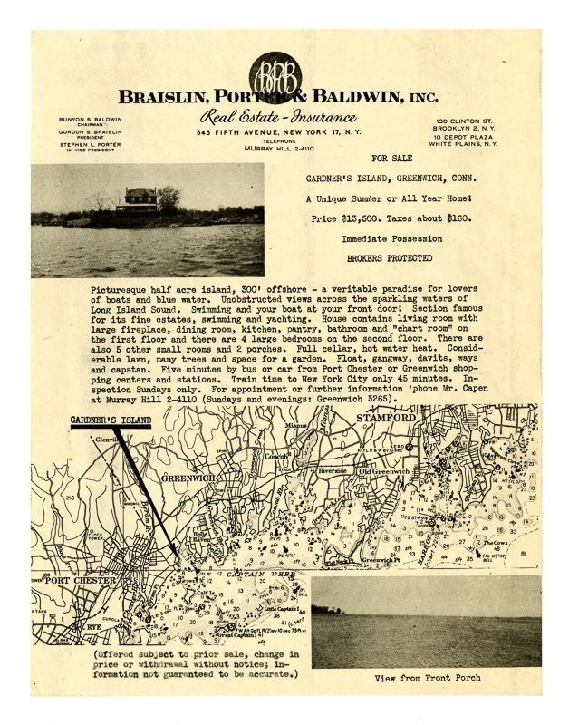 Ad with a view of the house from the water, a view from the front porch looking out on Long Island Sound, and a map of Greenwich and Stamford. Ad also describes the surrounding area and building.Collection