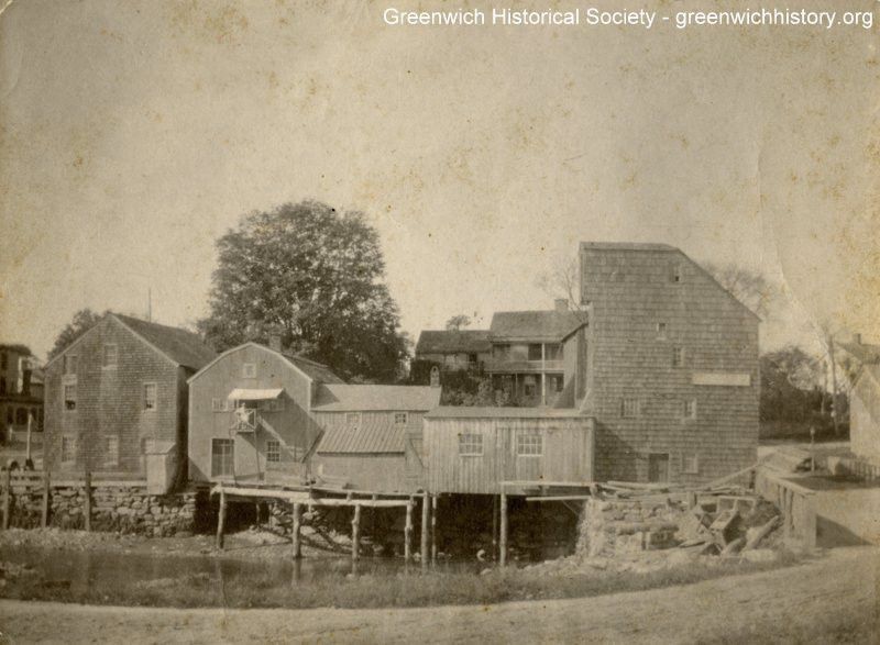 A view of the eastern sides of the David Bush tide mill (the tall structure at right side of image) as well as the stores and warehouses that lined the street across from Bush-Holley House (visible near image center).Collection