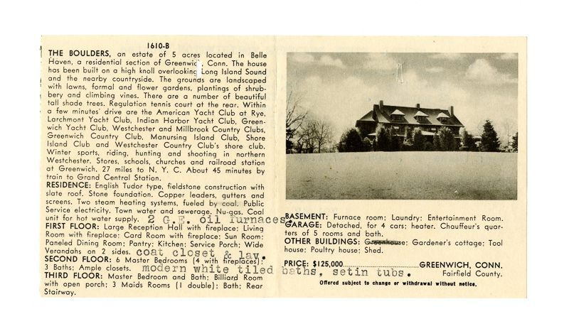 Ad with an image of the house and information about the estate's location, grounds, rooms, and price.