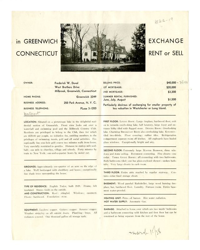 Ad with an image of the house and information on the house's location, grounds, rooms, and price.