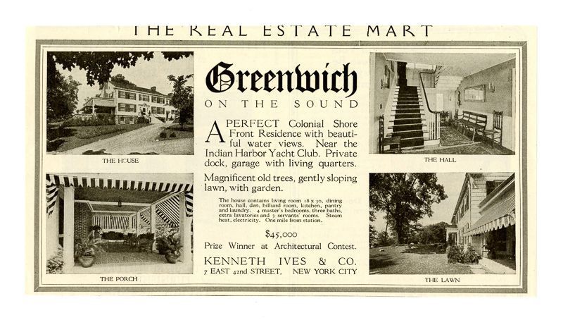 Ad with an image of the house, its porch, entrance hallway, and lawn. The ad also includes information on the house's location, grounds, rooms, and price.Collection
