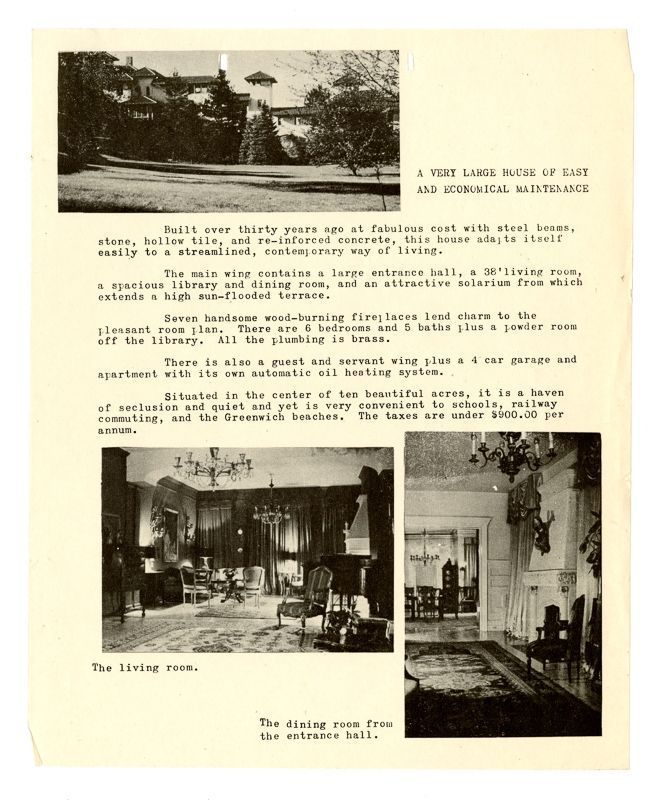 Ad with images of the house and its interiors. Ad also includes information on the house's architecture, rooms, and grounds.Collection
