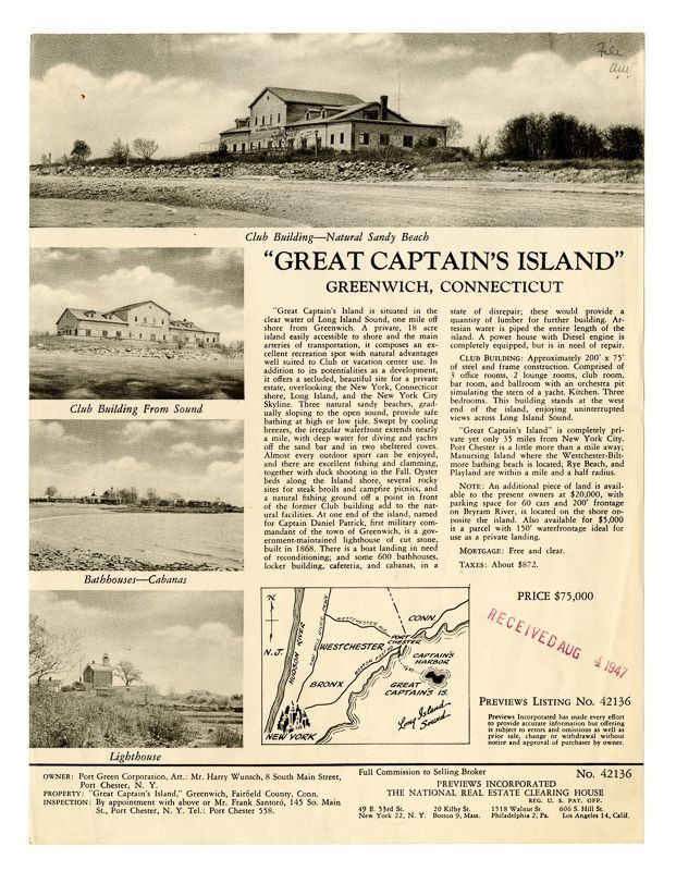 Ad for Great Captain's Island with images of Great Captain's Island Club, lighthouse, and bathhouses. The ad also has information about the location and buildings on the island.Collection