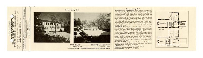 Ad with an image of the front of the house and its backyard. Ad also has floorplans and information of the house's location, rooms, and price.Collection