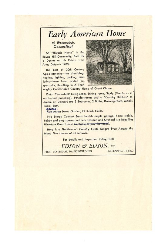 Ad with an image of the house and information on the house's history, rooms, outbuildings.