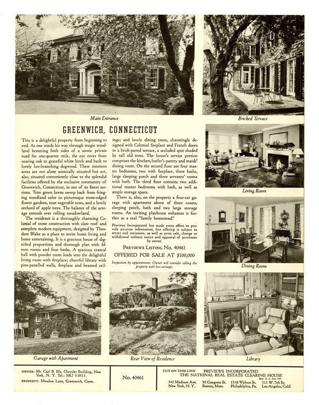 Ad with images of the house, its interiors, gardens, and garage. Ad also includes information on the house's location, grounds, rooms, and price.Collection