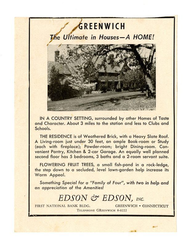Ad from "Town & Country" showing a view of the front of the house with information about the buildings, grounds, surrounding area, and price.Collection