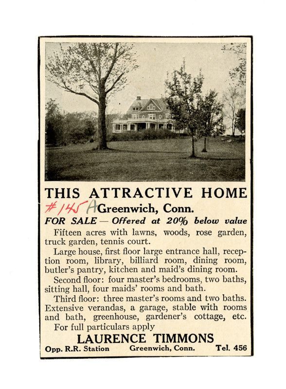 Newspaper ad with an image of the house and information about the house's grounds and rooms.
