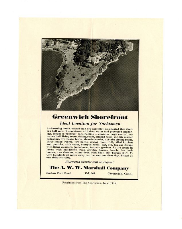 Ad with an aerial view of the house and the peninsula it is located on. Ad also has information about the house's location and rooms.Collection