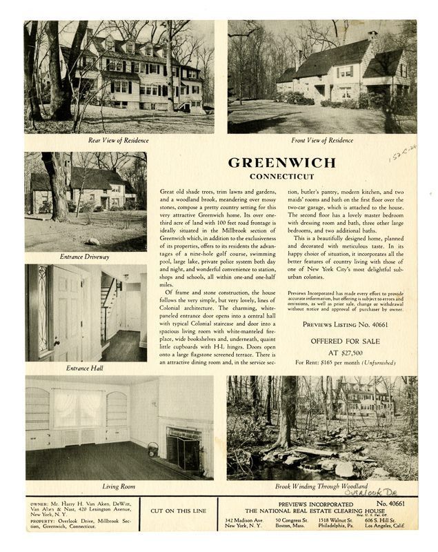 Ad with images of the house, its interiors, and part of its grounds. Ad also includes information on the house's architecture, rooms, and price.Collection