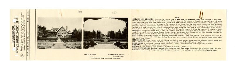 Ad with an image of the house and image of its grounds viewed from a terrace. Ad also includes information on its location, grounds, rooms, outbuildings, and price.Collection