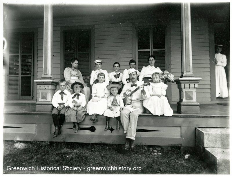 Gathering of five women, five children and one man sitting on a front porch. The man is holding a banjo and wearing a cap. Another lady, possibly a servant, stands in the back doorway watching.Collection