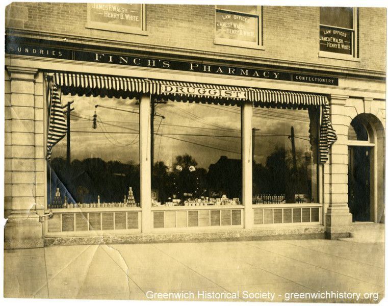 Finch's Pharmacy, located on Greenwich Avenue at the corner of Havemeyer Place. The windows of the law offices of James F. Walsh and Henry B. White are visible on the second floor.Collection