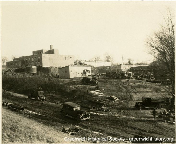 A Greenwich Water Company facility and surrounding property. Cars, trucks, pipes and other equipment are visible.