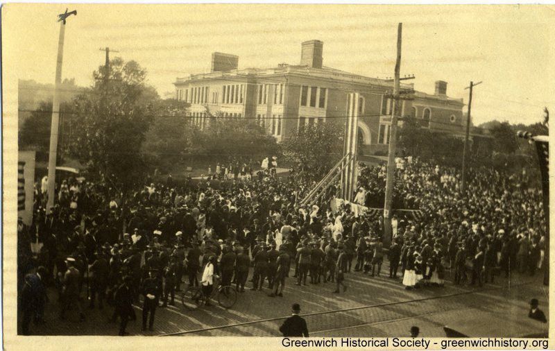 A large gathering of people on Greenwich Avenue near the intersection with Arch Street. An unidentified person appears to be speaking from a platform festooned with American Flag banners. The Havemeyer School is visible in the background and trolley tracks can be seen in the foreground.