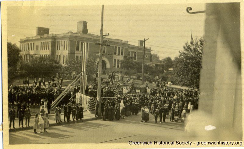 A large gathering of people is seen on Greenwich Avenue near the intersection with Arch Street. An unidentified person appears to be speaking from a platform festooned with American Flag banners. The Havemeyer School is visible in the background and trolley tracks can be seen in the foreground.