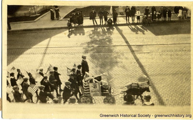 A group of men and boys parading up Greenwich Avenue by the Post Office building. Many of the boys are holding American flags. A cart decorated with American flags and a Liberty Loan poster is being pulled by what appears to be two dogs or small ponies. Spectators are visible on the side of the street by the Post Office.