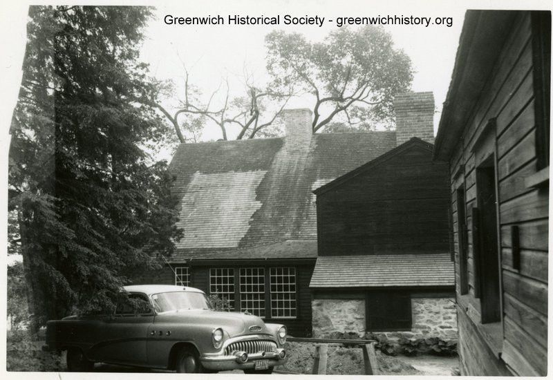 A car is seen parked at the top of the driveway behind Bush-Holley House. A portion of the rear of the house is visible. A portion of the north side of the wash house is at right.Collection