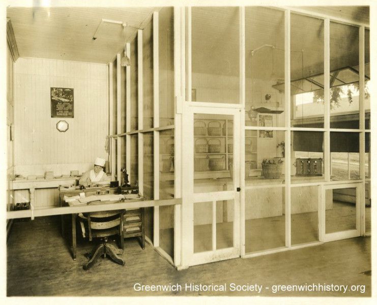 A woman wearing a kitchen uniform is working at a desk with a telephone. Baskets and a counter are visible in a screened room adjacent to the desk.Collection